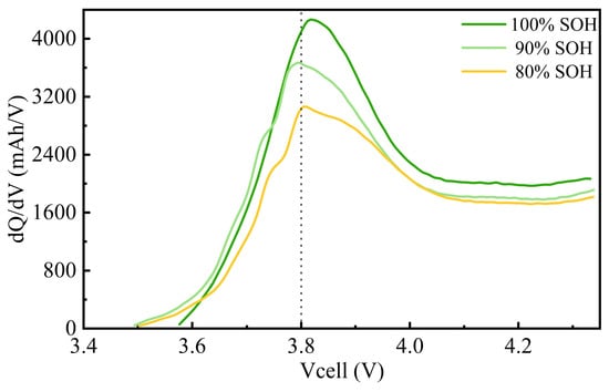 The differential capacity curves at different SOH levels (100%, 90%, and 80%) are shown in Figure 7. In lithium plating studies, a common criterion for identifying lithium plating is the observation of peaks in the voltage or current curves during the plating process [27]. However, due to the use of a 1.8 C charging rate, the electrochemical phase transition reactions within the battery were incomplete [28], and the high rate prevented the clear representation of lithium intercalation and deintercalation on the anode [29]. As a result, typical lithium plating peaks were not evident. The figure shows that, as the SOH decreases from 100% to 90% and 80%, the height of the peaks significantly decreases. This indicates a gradual reduction in the available capacity of the battery within the same voltage range. The primary causes of this include the gradual loss of active materials during long-term cycling, side reactions on the electrode surface, electrolyte decomposition, and thickening of the solid electrolyte interphase (SEI) layer, all of which reduce the effective active materials participating in electrochemical reactions. This loss of active materials leads to an overall decline in capacity, a typical manifestation of battery aging.
