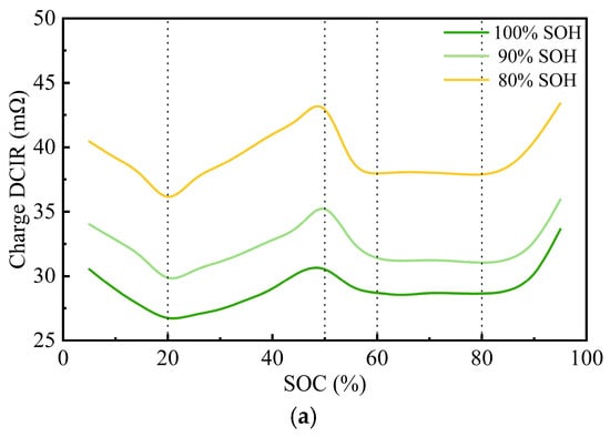 The trends and characteristic differences in the direct-current internal resistance during charging (DCIRc) from 0% to 100% SOC under different SOH conditions for the samples are shown in Figure 8.