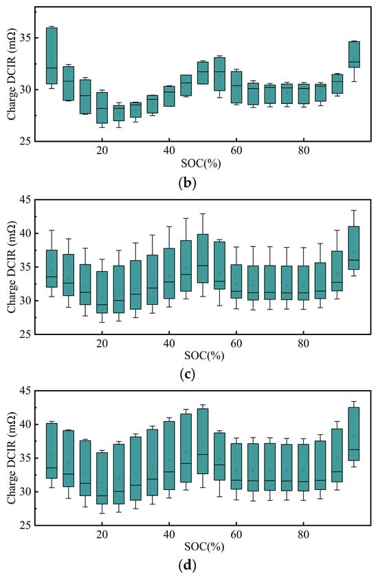 DCIR during charging at different SOH levels: (a) under different SOHs; (b) box plot at 100% SOH; (c) box plot at 90% SOH; and (d) box plot at 80% SOH.
