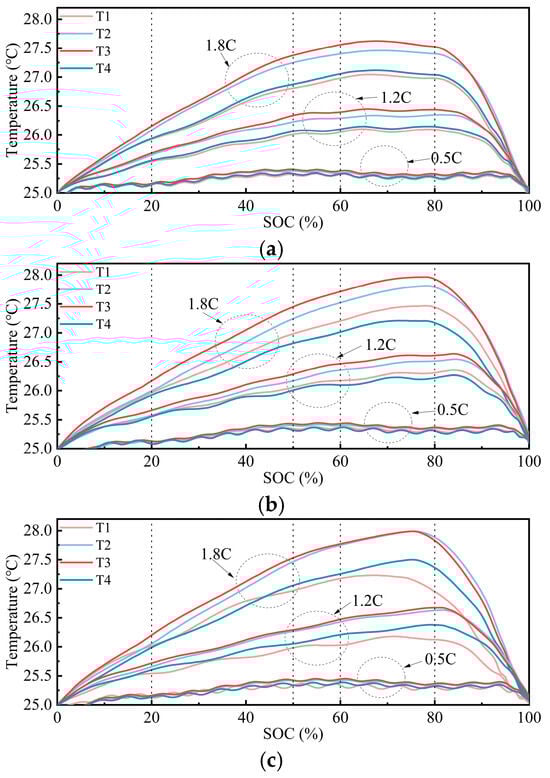 To further investigate the effect of the charging rate on the thermal behavior, temperature variations at the same locations under lower charging rates of 0.5 C and 1.2 C are presented in Figure 9. Under the 0.5 C charging condition, the overall temperature evolution exhibited a more subdued profile, characterized by a lower temperature increase and reduced fluctuation amplitude over the course of the charging process. In contrast, the temperature evolution under 1.2 C charging closely resembled the trend observed at 1.8 C, suggesting that the location-dependent thermal characteristics remained consistent across different C rates.