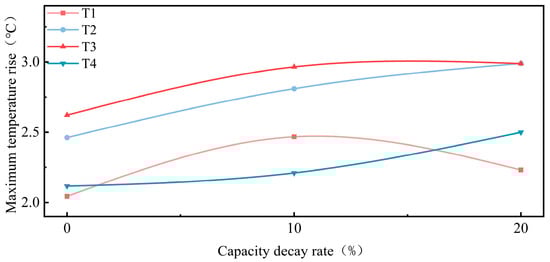 Figure 10 illustrates the relationship between capacity fade and the maximum temperature increase at different locations during charging. It can be observed that the maximum temperature increase at the center of the surface remained relatively high and increased as capacity fade progressed. This phenomenon underscores the strong correlation between temperature increase at the center of the surface of the battery and its health status.