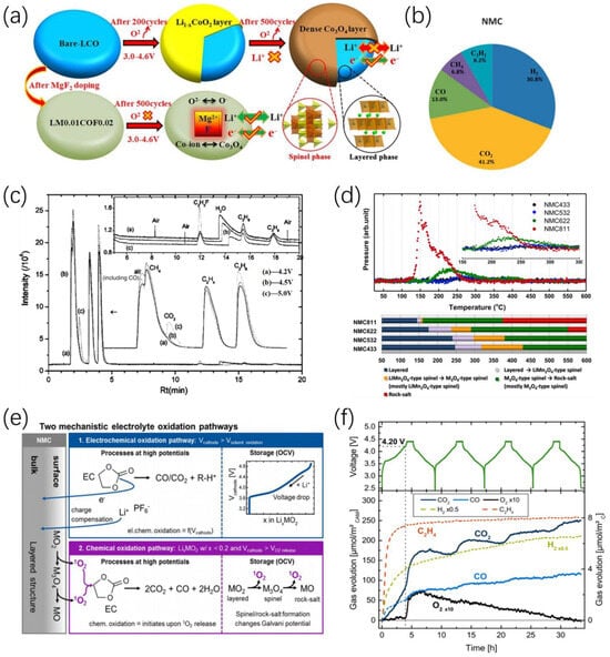 (a) The degradation mechanism schematic diagram of high-voltage LiCoO2 cathode materials []. (b) Components of the produced gases of NMC/graphite cells during the thermal runaway experiments []. (c) The gas chromatography of the LiCoO2 battery under different charging voltages []. (d) Mass spectroscopy profiles for the oxygen and the corresponding temperature region of the phase transitions for NMC samples []. (e) Schematic description of the proposed electrochemical and chemical electrolyte oxidation pathways (exemplarily shown for EC) which occur at high potentials []. (f) Evolution of gas during a high potential (solid lines indicate the gases stemming from the NMC electrode and dashed lines from the graphite electrode) [].
