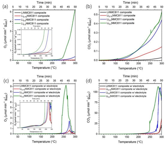 During heating from room temperature to 300 °C, (a) O2 and (b) CO2 release of NMC811 composites without the presence of an electrolyte. (c) O2 and (d) CO2 release of NMC811 composites with the presence of an electrolyte [].