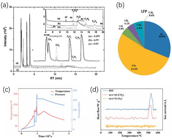 (a) The gas chromatography of the LiMn2O4 battery under different charging voltages []. (b) Components of the produced gases of LFO/graphite cells during the thermal runaway experiments []. (c) Closed container temperature and pressure characteristics of LFP batteries during TR []. (d) STA-MS curves of LFP battery cathode [].