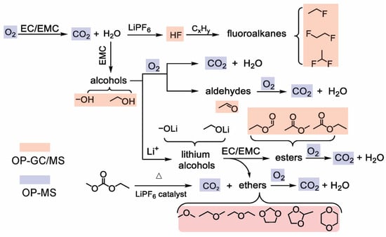 Proposed thermal failure mechanism/pathways on NCM cathode side. The blue region marks the gaseous species detected by OP-MS and the pink region marks the gaseous species detected by OP-GC/MS. The electrolyte and its thermal decomposition products continue to react with the released O2 on NCM cathode side during the heating process [].