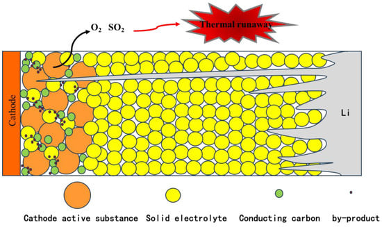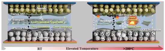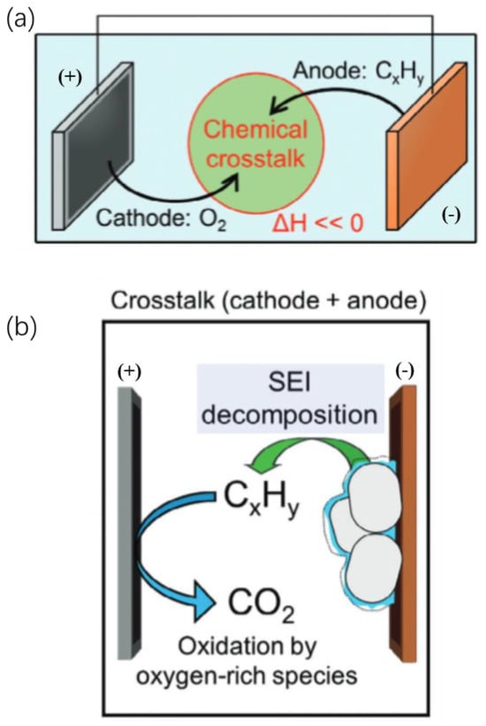 The crosstalk from anode gas generation to the cathode primarily stems from the reduction reactions of the electrolyte during charge–discharge cycles and gas generation under thermal runaway conditions. During initial cycling, SEI formation on the anode surface is accompanied by reductive gas generation, such as H2 and C2H4. These gases diffuse through the separator to the cathode, where they react with the cathode material, leading to surface passivation of the cathode and dissolution of transition metal ions, thereby accelerating capacity fading. Particularly under high-temperature or overcharging conditions, the thermal decomposition of the anode SEI generates a significant amount of reductive gases (e.g., H2, CH4, C2H4), which diffuse through the separator to the cathode and undergo intense exothermic reactions with oxygen species released from the cathode, triggering thermal runaway. Research indicates that the stability of the SEI on the anode material, the composition of the electrolyte, and the design of the separator are critical for suppressing the crosstalk from anode gas generation to the cathode. By optimizing the structure of the SEI, employing functional electrolyte additives, and designing separators with selective ion transport capabilities, the crosstalk from anode gas generation to the cathode can be effectively mitigated, thereby enhancing the safety and cycle life of the battery (Figure 11) [].