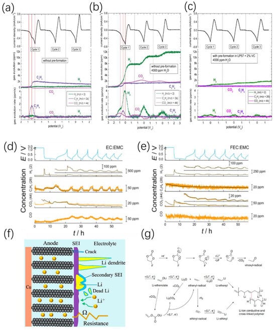 (a) Gas evolution during the first three formation cycles of a pristine graphite working-electrode vs. a metallic lithium counter-electrode in EC/EMC (<20 ppm H2O) []. (b) Gas evolution during the first three formation cycles of a pristine graphite working electrode vs. a metallic lithium counter-electrode in EC/EMC(4000 ppm H2O) []. (c) Gas evolution during three cycles of a pre-cycled graphite working electrode vs. a metallic lithium counter-electrode in EC/EMC containing 4000 ppm H2O. Pre-formation is performed with 10 galvanostatic charge/discharge cycles at C/10 in EC/EMC + 2% VC (<20 ppm H2O) []. The gas evolution for the first seven cycles of Si half-cells in (d) EC:EMC and (e) FEC:EMC []. (f) The degradation mechanism caused by lithium plating on anode under low temperature []. (g) Proposed mechanism for the reductive decomposition of FEC [].