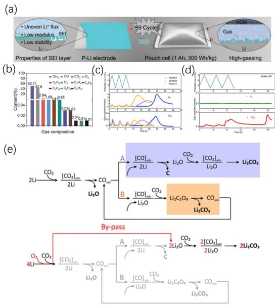 (a) Schematic illustrations of Li electrode structures in the high-energy Li metal pouch cells. (b) Type and content of gases produced in the Li/NCM523 pouch cell []. (c) In situ gaseous evolution rate for the NCMs-Li cells over three charge/discharge cycles, (d) In situ gaseous evolution rate for the NCM-LFP cells over three charge/discharge cycles []. (e) Pathway of the reaction of CO2 gas with the Li metal surface; pathway of the reaction of CO2 and O2 gases with the Li metal surface [].