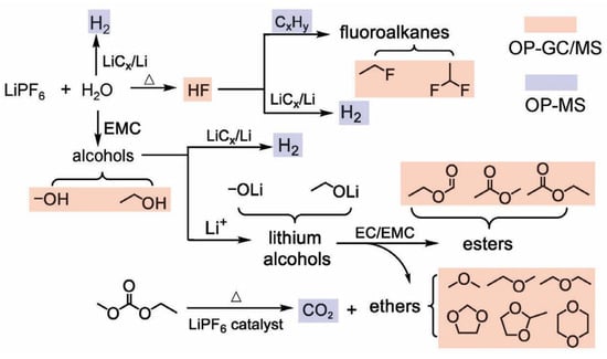 Thermal abuse tests on batteries detect the presence of HF and POF3 in the evolved gases (Figure 12f) []. As shown in Figure 14, both PF5 and POF3 can further decompose solvent molecules, leading to significant gas generation []. For example, PF5 reacts with DEC to produce C2H4, HF, and C2H5F:
