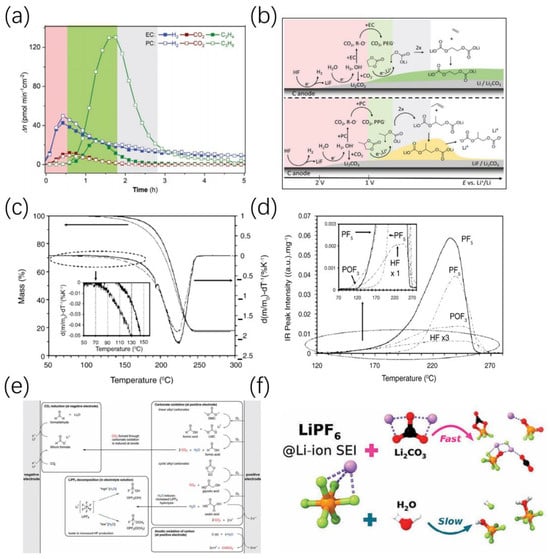(a) Associated gas evolution rates in EC:DEC (1:1 vol%) and in PC. (b) Schematic of the SEI formation process in EC-based electrolyte and PC-based electrolyte []. (c) Mass loss (left) and rate of mass loss (right) during thermal decomposition of LiPF6 containing <10 ppm H2O (solid line) and with 300 ppm water vapor (dashed line). (d) Evolution of gaseous products as a function of temperature during thermal decomposition of LiPF6 containing less than 10 ppm water (solid line) and with 300 ppm water vapor (dashed line) []. (e) Overview of electrolyte decomposition reactions that occur at high SOC/voltages initiated at the positive electrode []. (f) Comparison of two pathways for LiPF6 decomposition [].