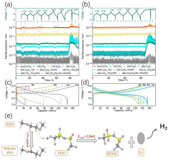 Electrolytes are critical components of lithium-ion batteries, often referred to as the “blood” of the battery. They facilitate ion transport between the electrodes and suppress parasitic reactions at the electrode/electrolyte interface by forming protective layers []. Electrolytes also significantly impact battery safety. This section reviews gas evolution behaviors in liquid- and solid-state electrolytes [].