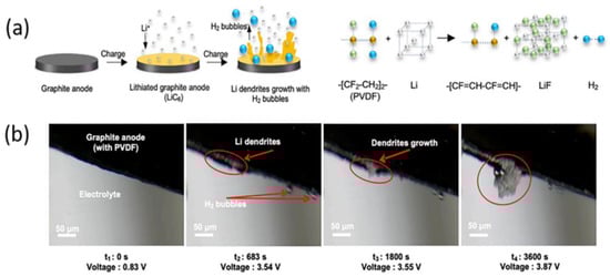 Gas evolution adversely affects lithium deposition morphology, leading to uneven deposition, dendrite growth, and dead lithium formation, severely impacting capacity and safety []. Lithium metal also reacts with gas species. For example, EC decomposition produces ethylene, which reacts with lithium to form LiH and Li2C2 []: