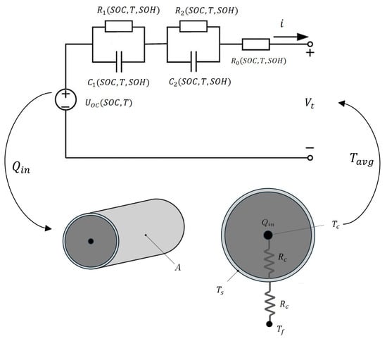 The electrical subsystem employs a second-order ECM with temperature- and state-dependent parameters, as defined by Equation (1).