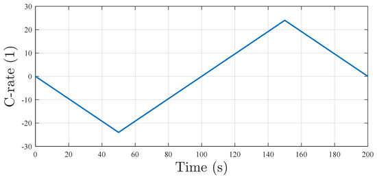 This subsection evaluates the algorithm’s capability to capture rapid thermal dynamics under extreme power conditions through high-rate charge–discharge cycle testing. A custom high-rate current profile (Figure 4) is designed to rigorously assess dynamic response performance. Under peak current rates exceeding 20 C, substantial heat accumulation induces pronounced core-to-surface temperature differentials (up to 6 K) and elevates the overall battery temperature to approximately 365 K within minutes.