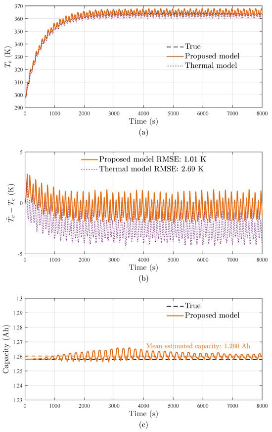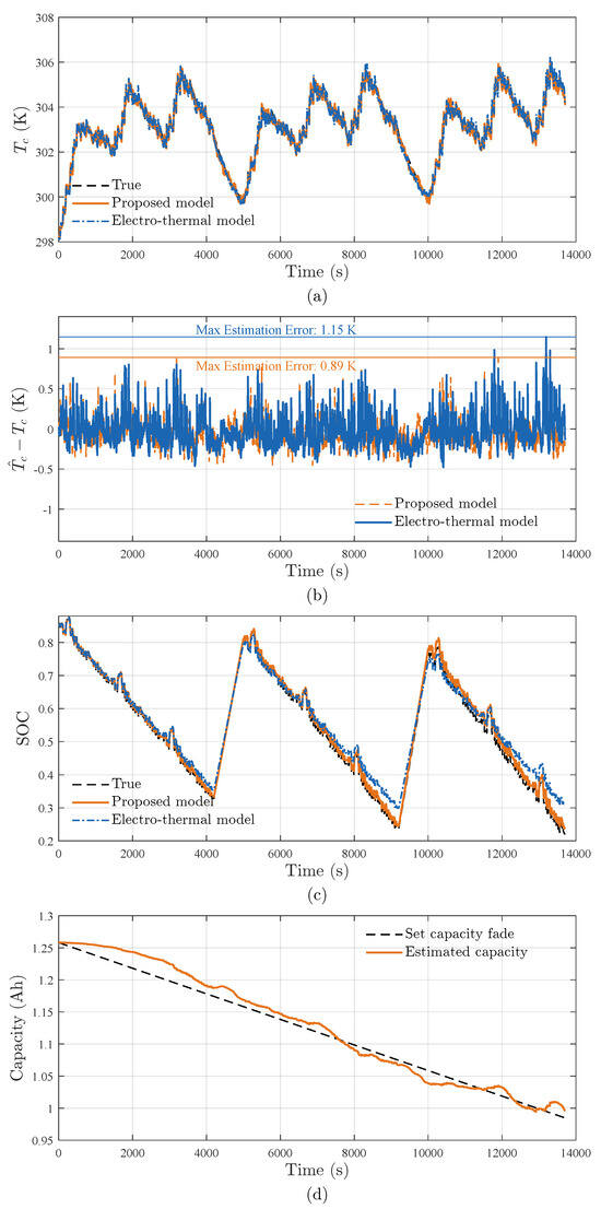 A comparative analysis with a standalone thermal model (referred to as ‘thermal model’ in subsequent sections) highlights the critical role of electrothermal coupling in the proposed framework. Specifically, the compared method proposed by Lin et al. [38] integrates a two-state thermal model into an EKF but excludes electrical measurements and neglects electrothermal interactions. This conventional approach assumes simplified Joule heating with a fixed internal resistance (), derived from average parameter estimates (typically sourced from datasheet in practical applications).