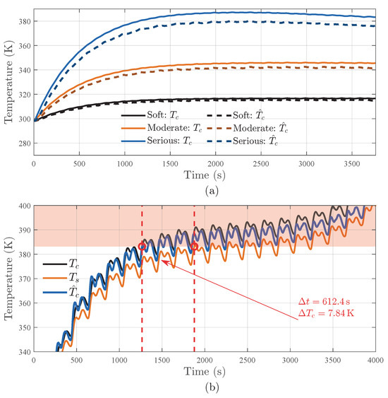 To quantify the safety improvements, a critical temperature threshold (383.15 K, corresponding to separator melting [39]) is established. Beyond this threshold, separator melting initiates more micro ISCs within the battery cell, which rapidly progress to macroscopic ISCs as the separator structural integrity fails. This cascade effect leads to accelerated temperature rise rates, ultimately culminating in thermal runaway and fire incidents. In Figure 7b, the red zone marks the hazardous temperature range (≥383.15 K) where TR becomes imminent. The proposed framework detects when the core hotspot enters this critical zone, enabling earlier alarm triggering and higher TR prevention likelihood compared with relying solely on as the direct input signal. The proposed method triggers the critical temperature alarm 612.4 s earlier via real-time core temperature estimation () compared to surface temperature-based alerts (). During this critical interval, the core temperature rises by 7.84 K, while surface measurements lag significantly, failing to reflect internal hotspot development. This delayed surface response risks catastrophic failure, as localized core temperatures may exceed safety limits long before surface sensors react. Overall, relying solely on surface temperature (Figure 7b) critically underestimates internal risks during fault evolution. Bridging this gap, the proposed framework can potentially help BTMS to deploy preventive measures earlier, decisively enhancing safety in real-world fault scenarios.