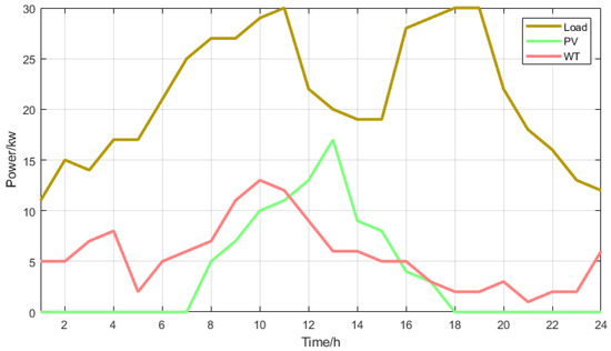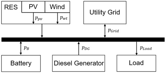 where represent the output power of the photovoltaic and wind turbines at time t, denotes the electrical load, and denotes the power output from the utility grid.