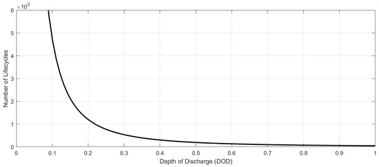 Therefore, the primary determinants of battery life are the actual full capacity and depth of discharge (DOD). Depending on different cycling events, there are typically two ways to define DOD. The first definition refers to the output energy at full capacity (100% SOC), while the second definition refers to a complete cycle composed of one charge–discharge event [21]. In this paper, we define DOD as the ratio of the energy change in one charge or discharge event to the energy at full battery capacity. Simultaneously, we define the actual full capacity of the battery as the energy that can be stored at 100% SOC. It should be noted that a cycle event is counted whenever the operating mode (charging and discharging) switches to the opposite side. The relationship between the number of battery cycles and DOD is illustrated in Figure 2. The fit of battery life is optimal when DOD = [22]: