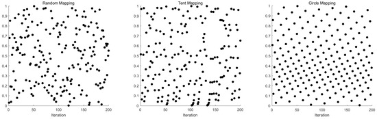 The SCA adopts a random generation of initial populations. Although convenient, this approach may lead to uneven population distribution and overall lower quality, resulting in instability in the early stages of algorithm execution. To address these issues, chaotic models are commonly employed during population generation to improve population quality. Currently used chaotic mappings include tent mapping, logistic mapping, and Chebyshev mapping [28]. Both Chebyshev and logistic mappings represent typical chaotic systems, where the mapping points exhibit high values at the ends and low values in the middle, causing uneven distribution, thereby affecting the algorithm’s search efficiency.