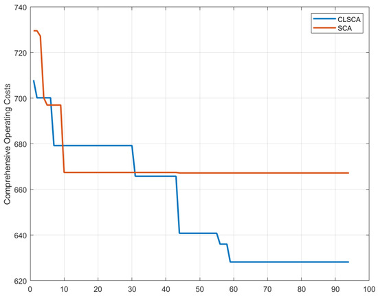 In this paper, an improved SCA (sine cosine algorithm) is employed to optimize the comprehensive cost of microgrids, taking into account the effects of electricity price fluctuations, environmental costs, and energy storage degradation costs. The improved optimal value evolution curves are shown in Figure 8 and Figure 9, where the vertical axis represents the optimal value of the comprehensive operating cost and the horizontal axis represents the number of iterations.