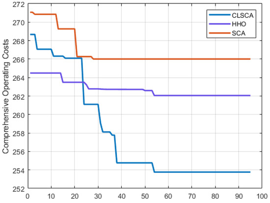 Compared with the SCA and the HHO algorithm [31], the CLACS optimal value curve will not fall into the optimal solution so quickly, and its fitness is also reduced. The comprehensive costs of the SCA and HHO in the urban interconnection mode are 668.4 and 651.1, respectively, and the comprehensive cost of the CLSCA is 629.5. The comprehensive costs of the SCA and HHO in the independent agricultural and pastoral area mode are 266 and 262.1, respectively, and the comprehensive cost of CLSCA is 253.8. The algorithm before the improvement in the figure begins to converge in the early iteration, while the improved algorithm begins to converge after about 60 iterations. This shows that the improved algorithm has better global exploration capabilities.