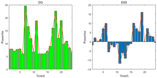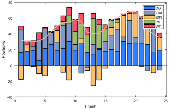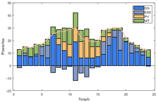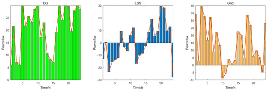 Figure 10 depicts the output power of diesel generators, energy storage batteries, and the utility grid obtained using the CLSCA under the condition of minimizing comprehensive costs. It can be observed that during the early morning period with the lowest electricity prices, the utility grid increases its output power while the batteries charge themselves, thereby achieving energy scheduling during periods of low load and low electricity prices. Meanwhile, during the period of 11:00 to 16:00 when the output power of renewable energy generation is relatively high, the output power of all three components decreases. This period coincides with the peak wind and sunlight intensity throughout the day. Furthermore, at around 10:00 and 11:00, a portion of the microgrid’s generation is sold back to the utility grid when electricity prices are highest. By selling excess electricity to the utility grid during peak price periods, the microgrid effectively reduces costs.