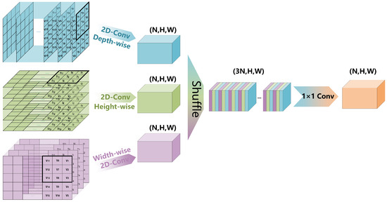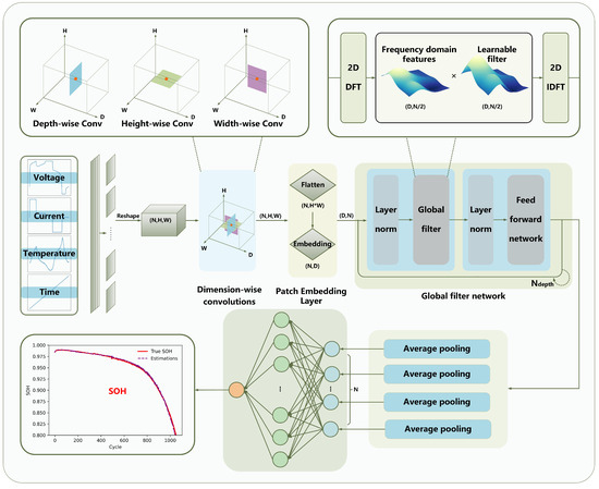 DimConv (Figure 1) initially executes two-dimensional convolutions across various dimensions. Subsequently, the respective features are uniformly shuffled and fused through a further layer that computes a linear combination of the output via 1 × 1 convolution [32]. Specifically, there are different convolutional kernels sliding along the planes perpendicular to the depth, height, and width dimensions. Specifically, as the convolution kernel moves along the plane perpendicular to the depth (depth-wise convolution), it captures the features among voltage, current, temperature, and time at a smaller temporal scale, while the convolution kernel moving along the plane perpendicular to the height (height-wise convolution) learns features over a larger temporal scale. Furthermore, the convolution kernel moving along the plane perpendicular to the width dimension (width-wise convolution)extracts features representing the individual spatial characteristics of voltage, current, temperature, and time at another time scale. Then, the output of various dimensions are uniformly shuffled. A 1 × 1 convolution, with input channels that are three times that of the output channels, is ultimately used to fuse the features derived from the three dimensions with the PReLU activation function, achieving the integration of two temporal scales and the enhancement of an individual feature in this process. This results in the retrieval of multi-scale local fusion features (N, H, W), where (H, W) is the size of each patch and N is the number of patches, which also serves as the effective input sequence length for global filter network.