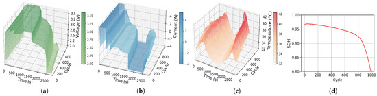 Datasets containing fast charging cycling data are originally provided by Severson et al. [39] and Attia et al. [40]. They involve a total of 169 commercial lithium ion phosphate (LFP)/graphite cells manufactured by A123 System (APR18650M1A), each with a nominal capacity of 1.1 Ah. All cells were cycled until they reached end-of-life (defined as 80% of their nominal capacity). The cell charging conditions consist of different types of multi-stage constant current (CC) charging, employing one-step, two-step, or four-step fast-charging strategies up to 80% state-of-charge (SOC) (Figure 3), mostly ranging from 3C to 8C [41]. Subsequently, the batteries were charged at 1C using a uniform constant current-constant voltage (CC-CV) protocol to a cutoff voltage of 3.6 V and a cutoff current of 0.02C. Finally, all batteries were discharged at a rate of 4C to a cutoff voltage of 2.0 V [39,40]. Voltage, current, and temperature directly from sensors were recorded during aging cycles. The discharge profiles exhibited differences across individual batteries, with most having a cycle life ranging from 500 to 1100 cycles. From Figure 3, it can be seen that the datasets provide rich voltage, current, and temperature information, which can be used by our model to further capture the underlying physical behaviors of the battery. Note that two of the 169 cells are excluded due to abnormal recorded data.