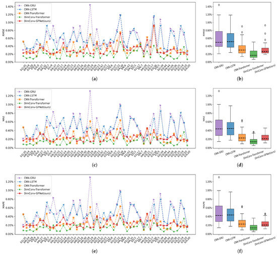 Comparison of different models for all test batteries. (a,b) RMSE, (c,d) MAE, and (e,f) MAPE.