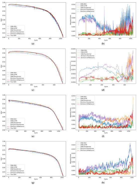 Figure 5 shows some SOH estimation results for batteries from four batches. It can be observed that the estimation results of DimConv-GFNet are not only closer to the true values in terms of overall trends but also more accurate at points of capacity fluctuation. The absolute error plots on the right side of Figure 5 clearly demonstrate that the DimConv-GFNet model (red line) consistently exhibits the lower estimation errors across all battery cycles. In contrast, other models experience significant error increases, particularly in the later stages. This indicates that the DimConv-GFNet model offers considerable efficiency and accuracy in SOH estimation tasks.
