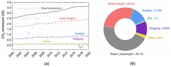 (a) Global CO2 emissions from the transport sector and (b) sector-wise breakdown for 2018 [2].