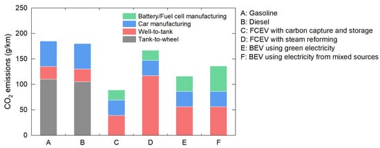 Lifecycle CO2 emissions for gasoline and diesel engine vehicles along with green alternatives like fuel cell electric vehicles (FCEV) and battery electric vehicles (BEV). Adapted from [2].