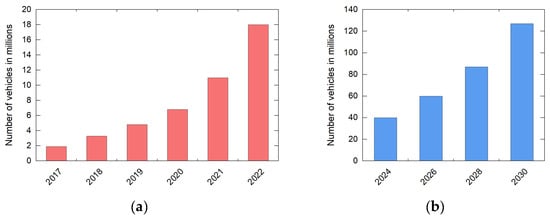 (a) Global number of Li-ion battery electric vehicles (EVs) in use and (b) projected growth of the global EV fleet.