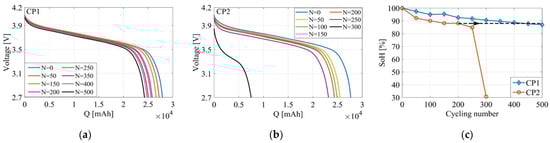 Discharge profiles for retired EV batteries. (a) Voltage vs. capacity at constant current using a regular cycling procedure (CP1), (b) voltage vs. capacity at constant current using a rapid cycling procedure (CP2), and (c) capacity-based SoH for both batteries. The black dotted line in part (c) indicates the same SoH for both cycling conditions. Reprinted from [27].