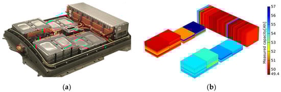 Additionally, variations in the orientation of Li-ion batteries within EV battery packs can result in non-uniform aging, potentially making second-life applications impractical [31]. Some cells may degrade faster than others depending on their position within the pack, creating imbalances that can negatively impact efficiency and longevity in their second life, as highlighted in Figure 6. Figure 6 shows the image of a retired 5-year-old Nissan Leaf battery pack and the measured capacity of each module for this pack. The capacity map in Figure 6b highlights the variation in performance across different modules, with some showing significant degradation. The modules at the beginning of life (BoL) had a capacity of 66.2 Ah at 100% SoC, while the modules at the end of life (EoL) exhibited capacities ranging from 49.4 to 57 Ah, corresponding to 75% to 86% SoH, where SoH is defined as the ratio of the nominal maximum capacity to the maximum capacity at BoL. Figure 6 further reveals that batteries oriented vertically aged more quickly than those positioned flat. However, within the flat-oriented batteries, there was a noticeable discrepancy in aging, with one side showing more significant degradation than the other. This non-uniform aging is likely due to uneven cooling within the battery pack, where one side may have been exposed to higher temperatures or less efficient heat dissipation. If these batteries transition to secondary applications, their reduced capacity and performance can limit their viability, especially in applications requiring consistent power delivery. For instance, a battery that has already lost a portion of its capacity in an EV may no longer meet the performance standards needed for grid storage or backup power systems, where reliability is crucial. To ensure the viability of retired EV batteries in second-life applications, additional precautions may be necessary. This includes careful screening and sorting based on remaining capacity and health before deployment, as well as implementing improved thermal management strategies designed specifically for second-life use. Enhanced cooling systems or passive thermal regulation can help maintain optimal operating conditions, particularly in stationary applications where batteries may be exposed to fluctuating environmental temperatures. These measures are essential to extend the usable life of second-life batteries and maximize their performance and safety.