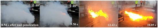 Images from the simulated mechanical abuse of a retired EV battery module highlight the rapid release of white vapor, followed by ignition within seconds [28].
