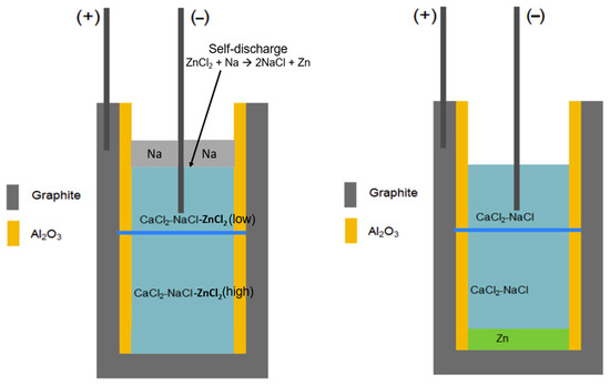 A schematic of a Na-ZnCl2 ALB cell with a NaCl-CaCl2 molten salt electrolyte in a fully charged state (left) [7] and a fully discharged state (right) with a porous ceramic diaphragm (blue line). It has the electrochemical reaction of ZnCl2 + Na (charged) ↔ 2NaCl + Zn (discharged) during charging/discharging.