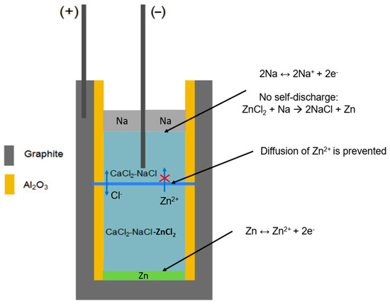 As an alternative to commercial sodium sulfur batteries, ZEBRA batteries (Na-NiCl2 solid electrolyte batteries, SEBs) have commercial applications since the starting of this century in energy storage, energy back up, transportation, etc. [1,2,3], due to their low costs, easy recyclability, long lifetime, and high safety [4]. In the commercial ZEBRA batteries, Ni electrode and beta-alumina solid electrolyte (BASE) have a larger than 70% share of the overall cell material costs [5]. By using abundant and low-cost Zn as an alternative to Ni, the next-generation ZEBRA battery (called here next-gen ZEBRA), i.e., Na-ZnCl2 SEB, could have much lower cell material costs [6]. Na-ZnCl2 all-liquid batteries (ALBs) replace (in addition to Zn replacement) the BASE electrolyte of the Na-ZnCl2 SEB with a molten salt electrolyte for even lower costs, easier recyclability, longer lifetime, and higher safety [7]. Compared to the commercial ZEBRA cells (operating at ~300 °C), the Na-ZnCl2 ALB cells do not use a BASE primary electrolyte, which reduces the cell costs and makes the scale-up easier [7,8]. It has a higher operating temperature (~600 °C) to be able to function in an all-liquid state, which improves performance. This boosts the ability to dis-/charge at high current density [7,8].