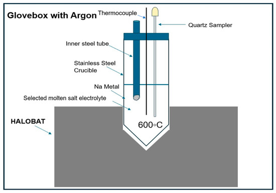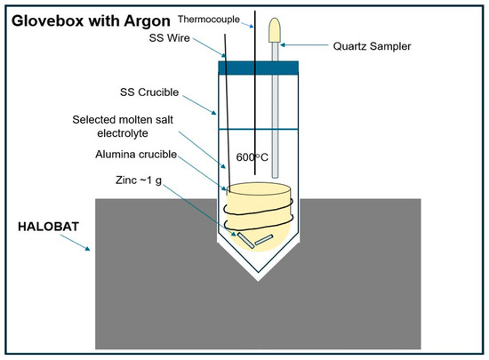 To measure the solubilities of Na and Zn electrode metals in the selected molten salt electrolytes (NaCl-CaCl2-BaCl2 37-45-18 mol%, NaCl-SrCl2-KCl 30.0-26.5-43.5 mol%), the electrode metal was in direct contact with the electrolyte at the ALB’s operating temperature (600 °C), and the solubility was measured versus the time of contact until saturation was reached. The tests were performed in an Ar inert environment (H2O and O2 < 1 ppm) inside the glovebox due to the salt mixture’s strong hygroscopicity. As shown in Figure 4, a specialized setup (named HaloBat) was prepared for the tests. This experimental setup consists of (1) an oven, (2) a stainless steel (SS) crucible containing the molten salt, and (3) a thermocouple to control the salt temperature with a temperature regulator. A quartz sampler, as shown in Figure 4 was used to collect salt samples. The amount of dissolved electrode metal in the electrolyte salt mixture was then analyzed with titration by a commercial automatic titrator (Titrando, Metrohm, Filderstadt, Germany).
