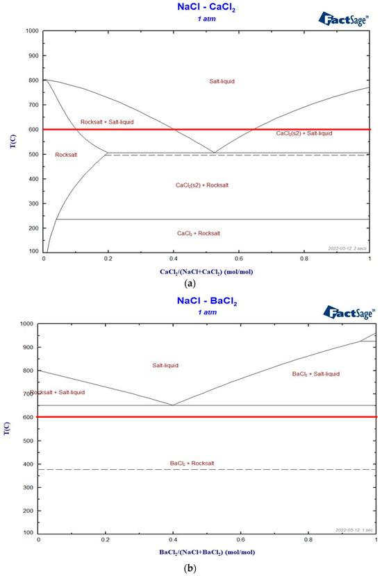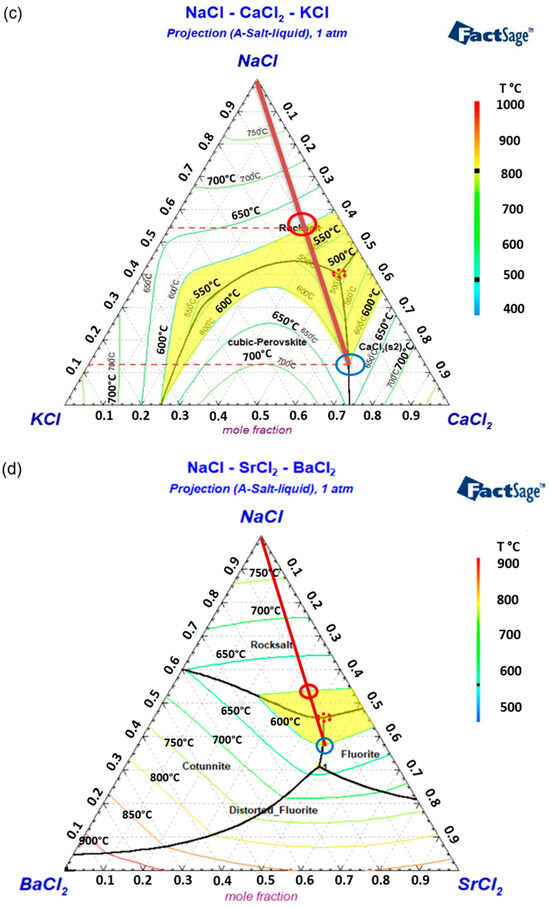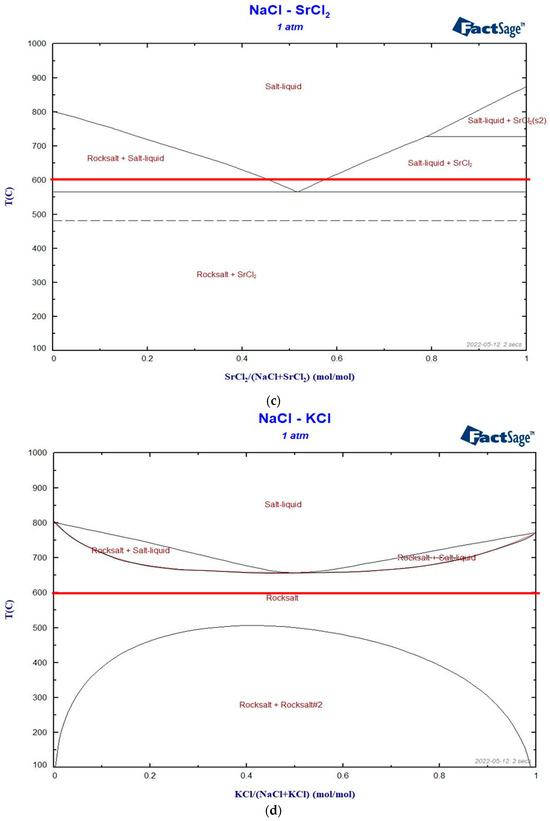 Simulated phase diagrams of (a) NaCl-CaCl2, (b) NaCl-BaCl2, (c) NaCl-SrCl2, and (d) NaCl-KCl. The red lines show the expected ALB working temperature of 600 °C. The dotted lines in these simulated phase diagrams represent condensed phase boundaries calculated for high pressures when the gas phase does not appear.