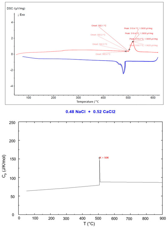 DSC test result for the eutectic NaCl-CaCl2 48–52 mol% (top) and simulated cp vs. T via FactSage (bottom). The red and blue lines in the DSC test result represent the heating and cooling curves, respectively.