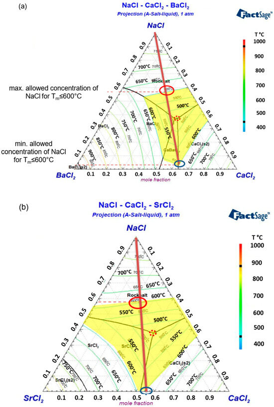 For the selected salts CaCl2, BaCl2, SrCl2, and KCl, all phase diagrams of the ternary salt systems with NaCl were also simulated with FactSage in this work. These five ternary systems (NaCl-CaCl2-BaCl2, NaCl-CaCl2-SrCl2, NaCl-CaCl2-KCl, NaCl-SrCl2-BaCl2, and NaCl-SrCl2-KCl) were selected for further investigation, whereas NaCl-BaCl2-KCl was not selected because of the high minimum melting temperatures of the NaCl-BaCl2 and NaCl-KCl systems (see Section 3.1.1). NaCl is the necessary salt as the active electrode component, CaCl2 and SrCl2 are the primary additives, and BaCl2 and KCl are the secondary additives to lower the melting temperature. All simulated ternary phase diagrams are shown in Figure 8. In the phase diagrams, the yellow areas in the phase diagrams represent the salt compositions with a melting temperature ≤ 600 °C. The dark red line shows the salt composition change in the selected molten salt electrolyte for each studied ternary salt system during charging/discharging under the assumption of no co-reduction of the Na electrode. These molten salt electrolytes were selected according to the largest potential allowed change in the NaCl mol% (i.e., largest potential charge/discharge range of the ALB cell) when they should be kept in an all-liquid state at the representative ALB operating temperature of 600 °C. The maximum and minimum allowed concentration of NaCl for Tm ≤ 600 °C (i.e., the largest potential charge/discharge range of the ALB cell) are pointed out with red and blue solid circles in the phase diagrams.