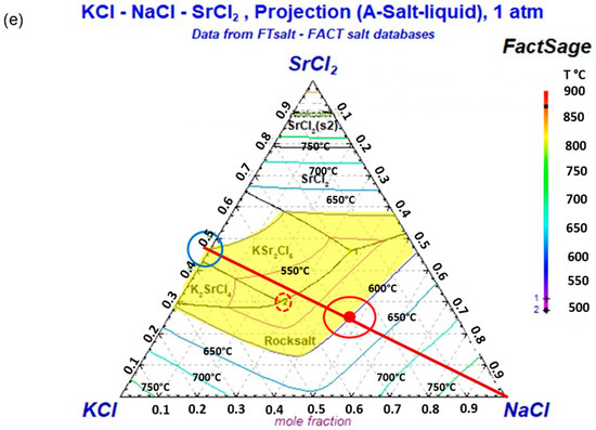 Simulated ternary phase diagrams: (a) NaCl-CaCl2-BaCl2, (b) NaCl-CaCl2-SrCl2, (c) NaCl-CaCl2-KCl, (d) NaCl-SrCl2-BaCl2, and (e) NaCl-SrCl2-KCl. Yellow areas in the phase diagrams represent the salt composition with a melting temperature not higher than 600 °C. Dark red lines show the changing salt composition during charging/discharging. The minimum temperature (eutectic) composition is pointed out with a red dotted circle. The maximum and minimum allowed concentrations of NaCl for Tm ≤ 600 °C (i.e., the largest potential charge/discharge ranges of the ALB cell) are pointed out with red and blue solid circles in the phase diagrams.