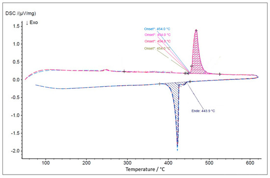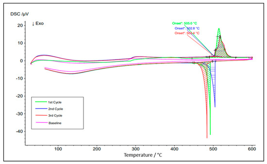 The melting temperature and behavior of the simulated eutectic NaCl-SrCl2-KCl (30.0-26.5-43.5 mol%) were also verified using the DSC measurement. The DSC curve in Figure 10 shows that only one peak (but not ideal) is observed when heating to above 600 °C and, also, when cooling to room temperature. During the cooling, the melting peaks increase sharply and at varying temperatures, which can be assigned to the subcooling phenomenon. This means that the salt mixture is almost eutectic. The melting temperature of the salt mixture is 503–505 °C (heating), which agrees well with the simulated value of 503 °C shown in the ternary phase diagram (Table 2) and also with the simulated cp vs. T (not presented in this work). Such a low-melting-temperature salt mixture is promising as a molten salt electrolyte for ALB. Compared to NaCl-CaCl2-BaCl2, the NaCl-SrCl2-KCl molten salt electrolyte has less of a co-reduction issue due to high EMFs, and thus, it is also strongly suggested that it be used in the ALB test cell and the ALB demonstrators under development.