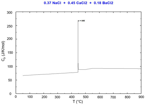 Figure 6 presents the binary system phase diagrams of NaCl with CaCl2, BaCl2, SrCl2, and KCl, which are simulated by FactSage. The phase diagrams show that the eutectic melting temperature of NaCl-CaCl2, NaCl-BaCl2, NaCl-SrCl2, and NaCl-KCl is about 506 °C, 650 °C, 560 °C, and 660 °C, respectively. The eutectic melting temperatures and salt compositions are summarized in Table 1. These simulated melting temperatures and melting behaviors (see, e.g., plot of cp vs. T in Figure 7 (bottom) for eutectic NaCl-CaCl2) agree well with the literature such as [32,33,34,35]. Comparison with the DSC measurement result on eutectic NaCl-CaCl2 in Figure 7 (measured melting temperature of 502 °C for the eutectic NaCl-CaCl2 48–52 mol%) also shows good agreement. Compared to BaCl2 and KCl, the eutectic binary mixtures with CaCl2 and SrCl2 have much lower eutectic melting temperatures (below 600 °C). Thus, in this work, CaCl2 and SrCl2 are selected as the primary additives for NaCl to have a low melting temperature of the salt mixture as the ALB molten salt electrolyte. Since CaCl2 could have a co-reduction issue and SrCl2 could have the cost issue, BaCl2 and KCl could be the third salt mixed to further reduce the melting temperature and/or material costs. The ternary phase diagrams studied will be presented in Section 3.1.2.