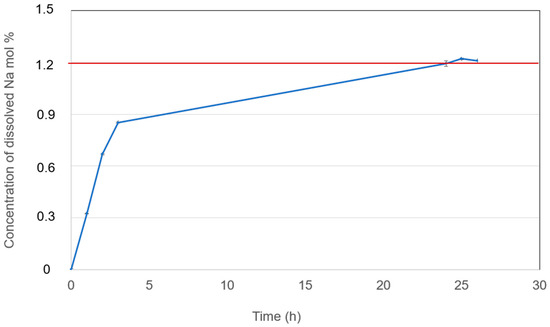Dissolved Na metal in selected NaCl-SrCl2-KCl (30.0-26.5-43.5 mol%) molten salt electrolyte at 600 °C with measurement error bar versus time. The red line represents the solubility of Na, i.e., the maximum concentrations of dissolved Na in the molten salt.