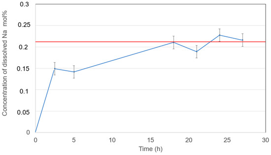 Dissolved Na metal in selected NaCl-CaCl2-BaCl2 (37.1-44.9-18.0 mol%) molten salt electrolyte at 600 °C with measurement error bar versus time. The measurement error bars are very small compared to the concentrations of dissolved Na. The red line represents the solubility of Na, i.e., the maximum concentrations of dissolved Na in the molten salt.