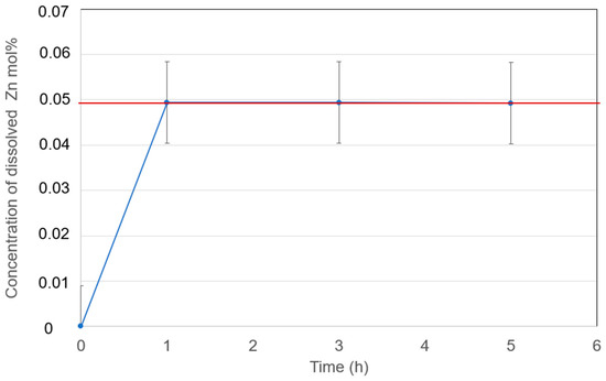Figure 13 shows the concentrations of dissolved Zn in the selected NaCl-CaCl2-BaCl2 (37.1-44.9-18.0 mol%) molten salt electrolyte at 600 °C with measurement error vs. time. In the first hour, the concentration of dissolved Zn rapidly increases with time to 0.04 mol%. After that, the concentration of dissolved Zn reaches the solubility limit (i.e., saturation concentration of dissolved Zn). The measurement errors are about 0.01 mol%. The Zn solubility in the selected NaCl-CaCl2-BaCl2 molten salt electrolyte at 600 °C is around 0.04 mol%.