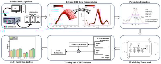 The overall framework for the proposed methodology is summarized in Figure 1, which outlines the key steps involved in the process. First, lithium-ion batteries undergo cycling tests and EIS measurements to evaluate their degradation behavior. The EIS data are then processed using the DRT method, which deconvolutes the impedance spectra to isolate critical processes, particularly the charge transfer peak. Key DRT parameters are extracted as quantitative features reflecting the charge transfer resistance and associated aging mechanisms [14]. These features are analyzed and subsequently used as inputs to a LSTM model, which is trained to predict the SOH of the batteries. Finally, the performance of the LSTM model is evaluated using prediction results and error metrics, confirming the accuracy and robustness of the approach. This integrated framework demonstrates the effective combination of an advanced electrochemical analysis with AI-based modeling for accurate SOH estimations.