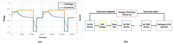 Data acquisition network. (a) CCCV charge discharge profile, (b) EIS tests framework.